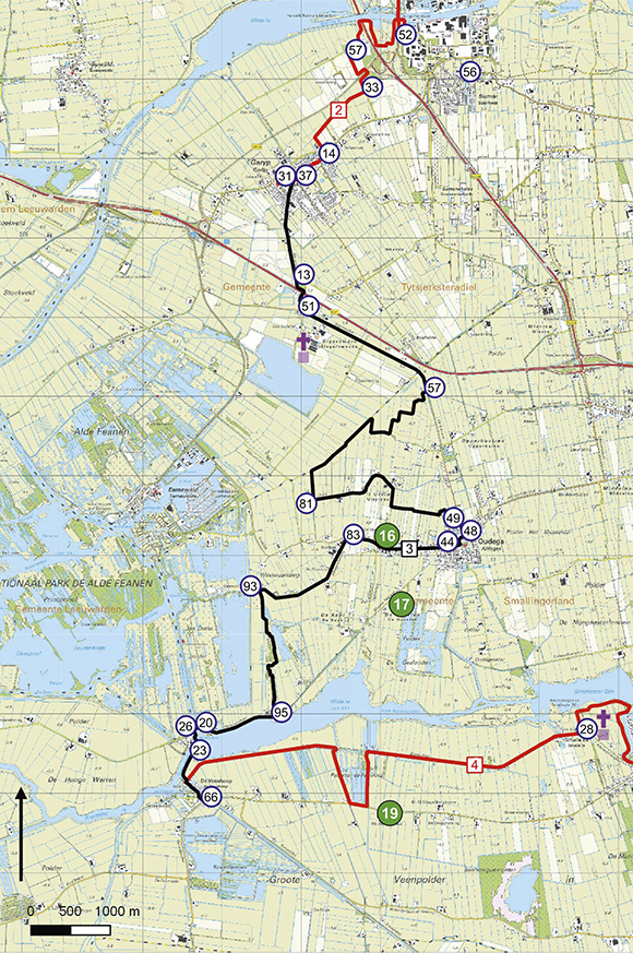 Vanaf 31 over Mounehoek langs bakkerij Van der Zee dorp uit. 13 - 51 - 57 Streekpad volgen door Sigerswâld, tunnel onder weg door op T LA naar Oudega over Sigerswâld, voorbij bocht naar rechts en Zustervaart RA boerenpad door de weilanden langs boomstrook naar 81 - 49 48 - 44 - 83 - 93 - 95 - 20 - 26 - 23 - 66.